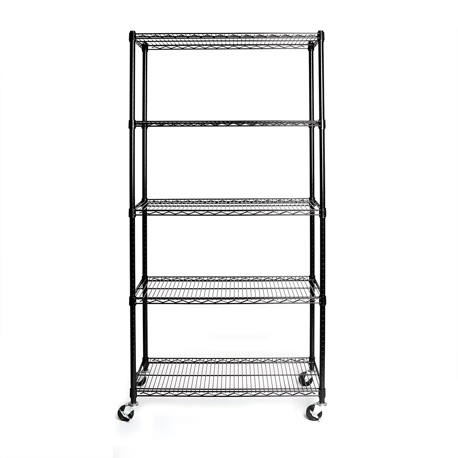 NSF & ISO Certified Epoxy Coating and Chrome Plated Layers Mobile Metal Wire Shelving 5-Tier Casters Steel in Black Wire Shelvin
